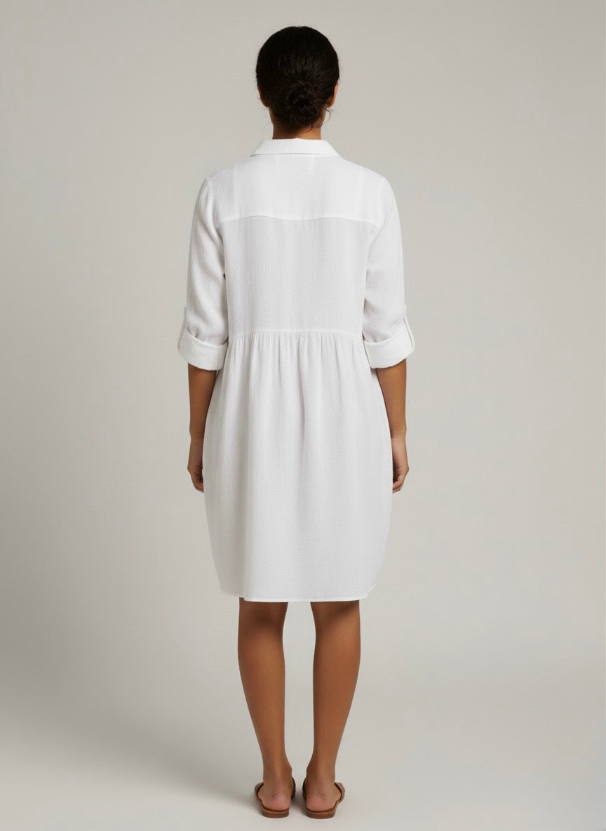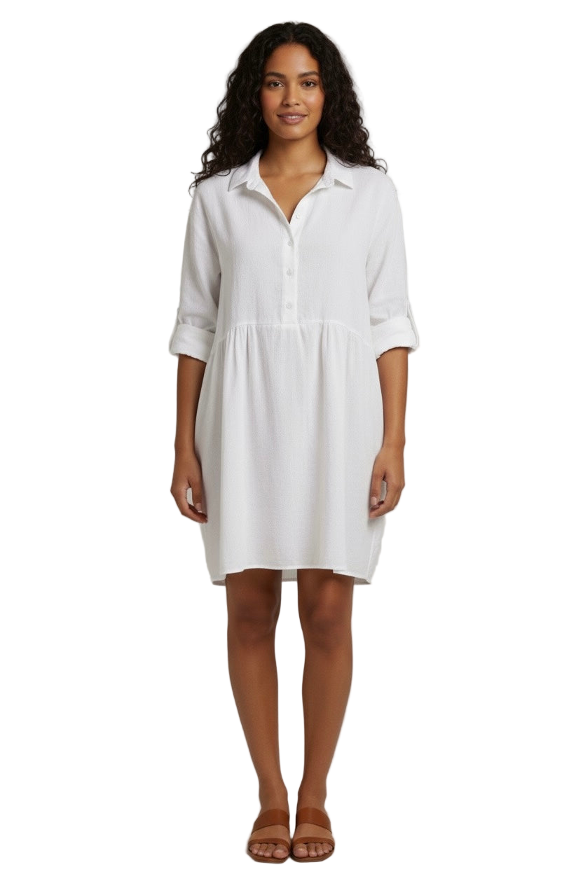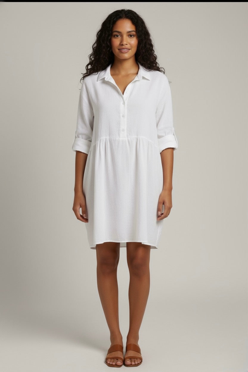 Discover effortless summer style with our Penny Mini Shirt Dress. Made from 100% lightweight cotton, this dress is designed for ultimate comfort and breathability, making it the perfect addition to your summer wardrobe.